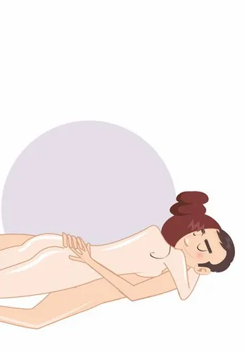 Мужчина садится на кровать, горизонтально вытянув ноги. Женщина ложится на него сверху так, что ее ноги оказываются повернутыми в противоположную сторону, а она лежит на животе. Женщина вытягивает ноги назад и расслабляет торс, находящийся между ногами партнера, а потом начинает скользить вверх-вниз и использует для этого еще и ноги.