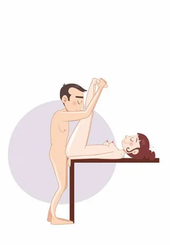 Женщина ложится на стол или на что-нибудь подходящее по высоте и пододвигается к его краю. Под зад ей можно положить подушку, чтобы вам обоим было удобнее и чтобы быть как можно ближе друг к другу. Она может положить руки под подушку, чтобы было удобнее поднимать таз еще выше, держаться за стол или ничем их не занимать. Мужчина входит в нее стоя. Если вы решили устроиться на кровати, можно встать на колени. Держи ее ноги, чтобы соблюдать баланс — это даст вам дополнительную устойчивость и возможность более глубокого проникновения.
