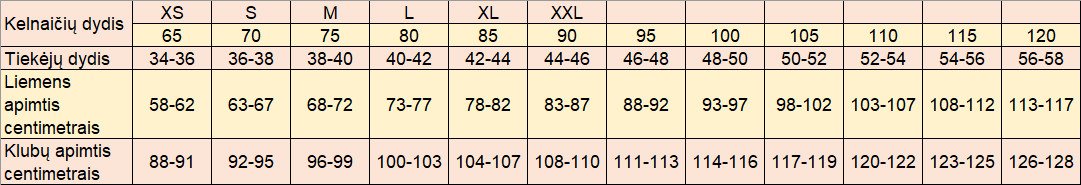 Liemenį matuokite ties ploniausia talijos vieta.Klubus matuokite ties plačiausia jų vieta.Centimetro juostelė turi tvirtai priglusti prie kūno.Iš gauto klubų apimties dydžio atėmus gautą liemens apimties dydį gaunamas klubų pakilimo dydis.Klubų pakilimo dydis neturėtų būti mažesnis nei 25 cm ir didesnis nei 28 cm.Jei klubų pakilimo dydis atitinka nustatytas ribas – liemens apimtis atitinka tikrąjį kelnaičių dydį.Jei klubų pakilimo dydis didesnis nei 28 cm – rinkitės artimiausią didesnį kelnaičių dydį.Jei klubų pakilimo dydis mažesnis nei 25 cm – rinkitės artimiausią mažesnį kelnaičių dydį.