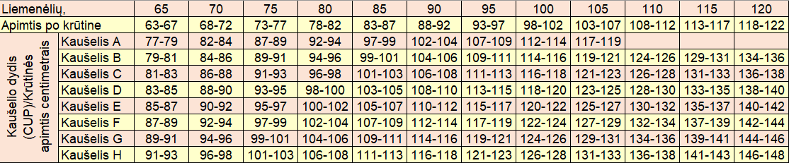 Kaušelio dydis nustatomas iš gauto krūtinės apimties skaičiaus atėmus apimties po krūtine skaičių.