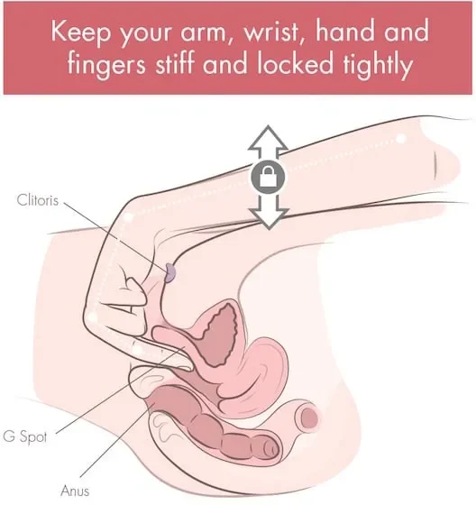 Įkišdami pirštą, turite braukti piršto pagalvėlę (tai sritis su piršto atspaudu) prieš makšties sienelės viršų, kaip parodyta paveikslėlyje aukščiau. Švelniai glostykite tą sritį viduriniu pirštu ir stebėkite, kaip ji reaguoja.