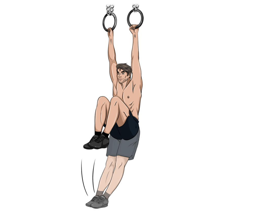 Pakabinkitės ant skersinio arba žiedų, rankas išskėskite pečių plotyje.